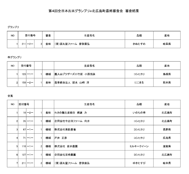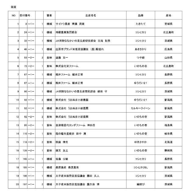 一般審査で試食した5種類のお米はどこの何というお米かはわかりませんので、グランプリや金賞、銀賞に入っているかどうかは、試食したお米の受付番号が最終結果のリストにあるかどうかを調べるしかありません